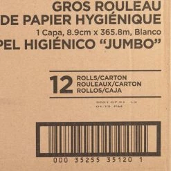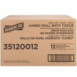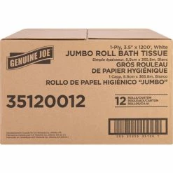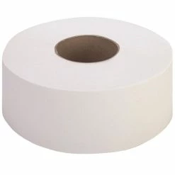 This jumbo roll of one-ply bathroom tissue satisfies everyday needs. Made from a high percentage of recycled fiber, it exceeds EPA comprehensive procurement guidelines. This bathroom tissue is cost-effective solution for all areas and is safe for sewer and septic system. It fits in bathroom tissue dispensers that hold a 12″ diameter roll.