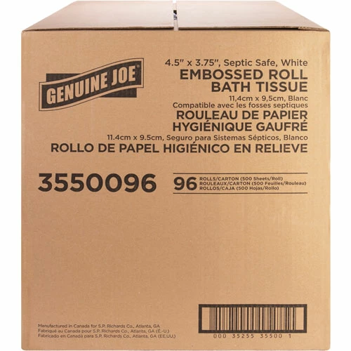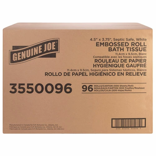 Embossed bath tissue offers two-ply sheets that are securely overall-wrapped for maximum sanitation. Perforated tissue offers exceptional whiteness, absorbency and softness and is suited for restroom applications. Each roll fits standard-roll, bathroom-tissue dispensers. Tissue is made from a high percentage of recycled fiber with post-consumer material that easily exceeds EPA guidelines.