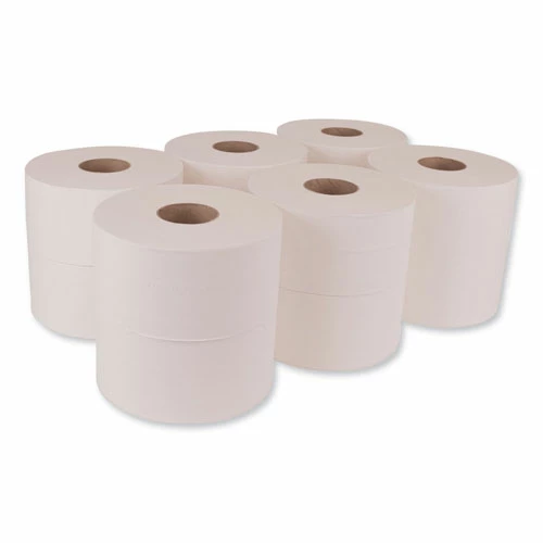 Torkยฎ Advanced Jumbo Bath Tissue’s high capacity allows for fewer refills and reduced labor. Our roll design ensures easy and intuitive maintenance, refilling and use. Large size reduces pilferage as it is hard to conceal and can’t be used at home. Suitable for high to medium traffic restrooms and easy to maintain. This bath tissue is perforated for ease of tearing. Fewer cores and no wrappers leads to source reduction and less waste. Tork toilet paper has rapid breakup, ideal for all plumbing systems. All Tork bath tissue products are safe for septic systems. Available in an Easy Handlingยฎ carry box.