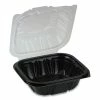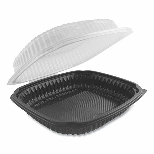 Culinary Lites hinged containers offer increased value and affordable alternatives to foam and paper clamshells. Will withstand temperatures to 210Β°F under heat lamps, in warming units and microwaves. The clear, anti-fog lid is vented to allow steam to dissipate, keeping food looking fresh and appealing while eliminating order errors. Stacking will not block the vents to preserve the texture of the food and the positive stack maintains the food presentation during transport. Secure snap closure ensures freshness and eliminates messy spills. Offset tabs make it easy to open and reclose. The durable, cut-resistant polypropylene allows your customers to eat right out of the container.