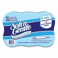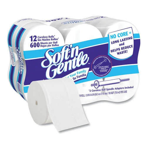 Coreless rolls allow consumers to use 100% of the toilet paper and eliminate waste. Convenient size, 12 rolls per case, 600 sheets per roll to reduce restocking trips. Every pack includes two white spindles, which are compatible with standard horizontal bath tissue holders.