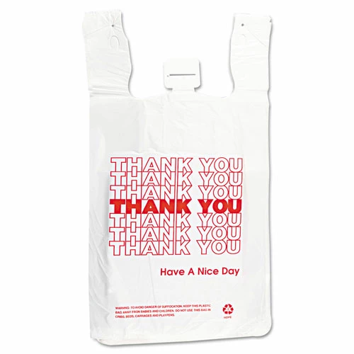All-purpose white plastic bag with “Thank You” design. Ideal for use at checkout counters at grocery stores, restaurant to-go areas and more. Made out of HDPE film.