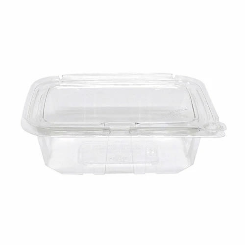 RPET Hinged Lid Tamper Evident Containers will not only enhance the look of your product with their clarity but also feature a patented security button tab feature which inhibits tampering, ensures quality and eliminates the need for shrink bands and wrap labels. Unlike other containers that require a plastic tear-off strip, this container has no external pieces to throw away which makes the container smoother and safer for handling. The engineered tight rim seal and audible click of the security button tab promise a leak-resistant experience. These containers are made from 100% post-consumer recycled PET. They are available in sizes 8~64 oz. and are perfect for all deli product needs including cold pasta, fruit salad, leafy green salad, sandwiches, nuts, snack mixes, candy, desserts, and more.