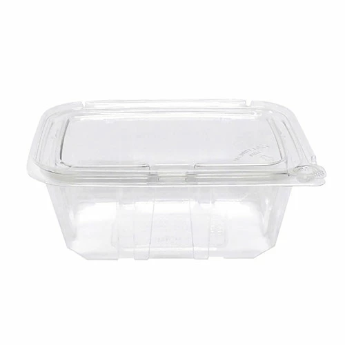 RPET Hinged Lid Tamper Evident Containers will not only enhance the look of your product with their clarity but also feature a patented security button tab feature which inhibits tampering, ensures quality and eliminates the need for shrink bands and wrap labels. Unlike other containers that require a plastic tear-off strip, this container has no external pieces to throw away which makes the container smoother and safer for handling. The engineered tight rim seal and audible click of the security button tab promise a leak-resistant experience. These containers are made from 100% post-consumer recycled PET. They are available in sizes 8~64 oz. and are perfect for all deli product needs including cold pasta, fruit salad, leafy green salad, sandwiches, nuts, snack mixes, candy, desserts, and more.