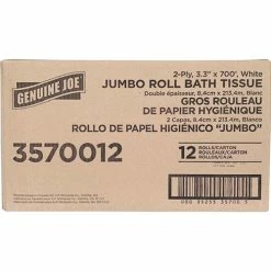 This jumbo roll of two-ply bathroom tissue satisfies everyday needs. Made from a high percentage of recycled fiber, it exceeds EPA comprehensive procurement guidelines. This bathroom tissue is cost-effective solution for all areas and is safe for sewer and septic system. It fits in bathroom tissue dispensers that hold a 12″ diameter roll.