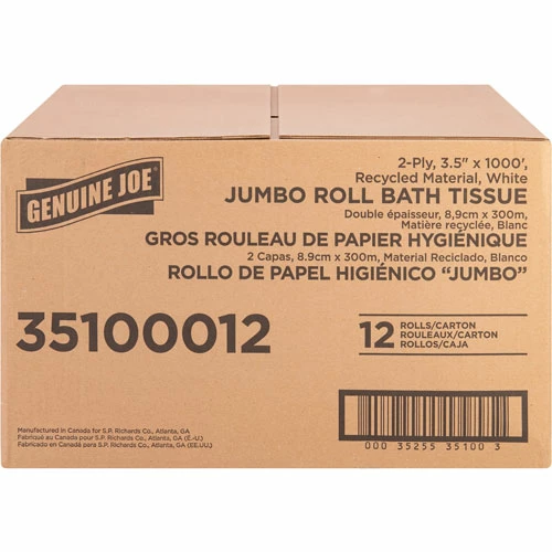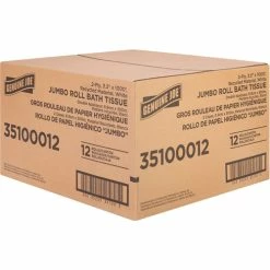 This jumbo roll of two-ply bathroom tissue satisfies everyday needs. Made from a high percentage of recycled fiber, it exceeds EPA comprehensive procurement guidelines. This bathroom tissue is cost-effective solution for all areas and is safe for sewer and septic system. It fits in bathroom tissue dispensers that hold a 12″ diameter roll.