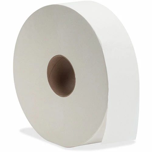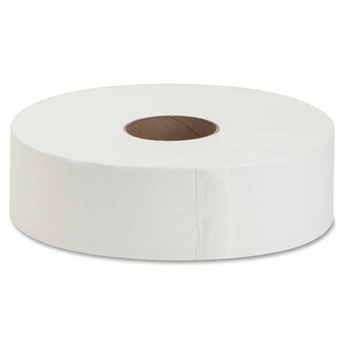 This jumbo roll of bathroom tissue satisfies everyday needs. Made from a high percentage of recycled fiber, it exceeds EPA comprehensive procurement guidelines. This bathroom tissue is an affordable solution for all areas. It fits in bathroom tissue dispensers that hold a 12″ diameter roll.