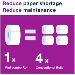 Two-ply bathroom tissue’s high-capacity allows fewer refills and reduced labor. Special roll design ensures easy and intuitive maintenance, refilling and use. Large size reduces pilferage as it is hard to conceal and can’t be used at home. Rapid breakup accommodates all plumbing systems. Bathroom tissue is perfect for medium to high-traffic washrooms.
