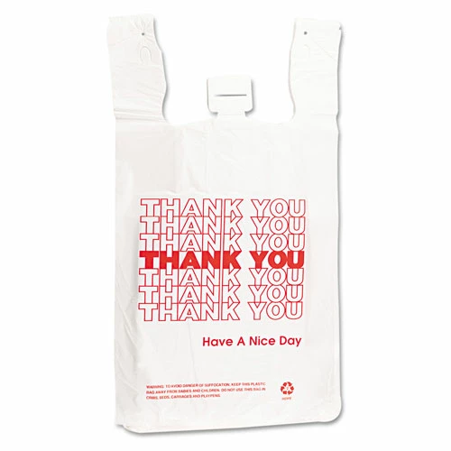 Politeness counts. Plastic thank-you T-sacks are a nice way to treat customers. Good for all types of businesses. Application: Shopping; Thickness: 2 mil; Material(s): Plastic; Depth: 6″.